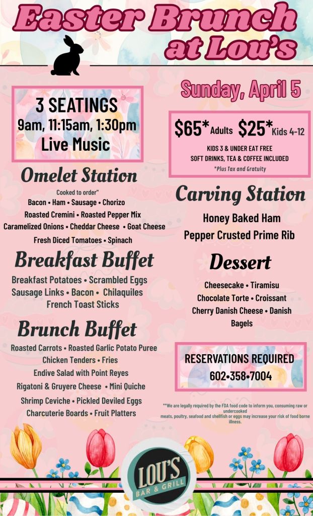 Celebrate Easter with us at Lou’s on Sunday, April 5th, for a special Easter Brunch featuring seasonal favorites and festive offerings the whole family will enjoy.